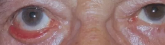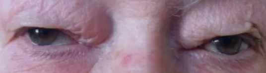 • povešeno kožo zgornjih in spodnjih vek (dermatohalaza),